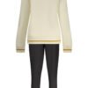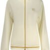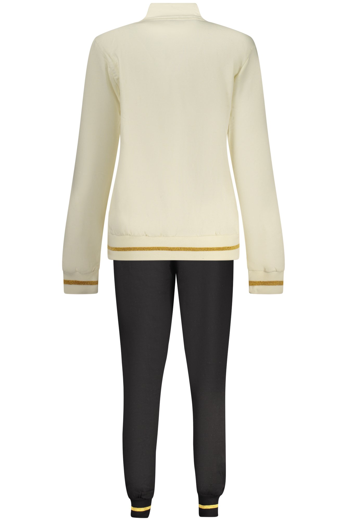 TUTA SPORTIVA FELPATA, FELPA MANICHE LUNGHE IN BIANCO, 2 TASCHE, FULL ZIP, PANTALONE NERO, ELASTICO IN VITA CON LACCI, 2 TASCHE, DETTAGLI A CONTRASTO, APPLICAZIONE STRASS, LOGO