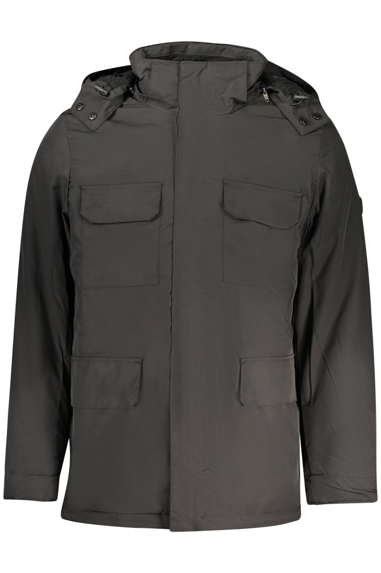 GIUBBOTTO LUNGO MANICHE LUNGHE CON CAPPUCCIO REMOVIBILE, PARKA, 4 TASCONI ESTERNI, 1 TASCA INTERNA, INTERNO CON PELO EFFETTO PECORA, ZIP, AUTOMATICI, APPLICAZIONE, LOGO